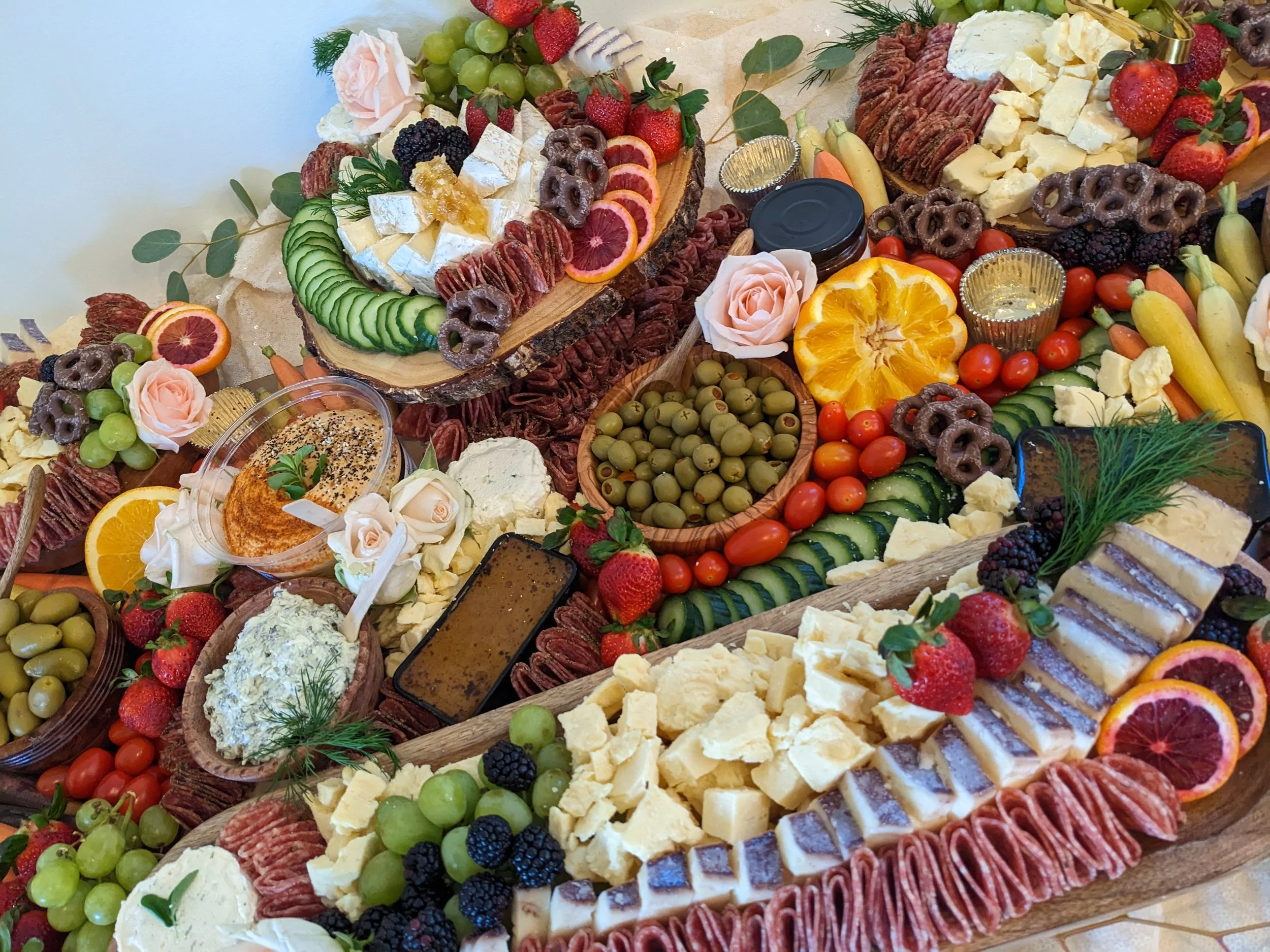 Styled on food safe paper and includes an assortment of specialty cheeses, curated meats, crackers, bread, vegetables, fresh fruits, dried fruits, nuts, jams/jelly, honey, chocolate, olives, cornichons, etc and garnished with fresh flowers and herbs.